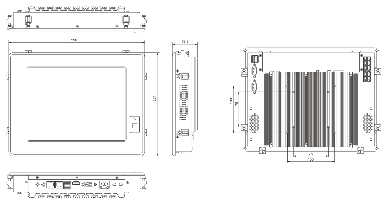 5*RS-232, 1*RS422/485,2個DB9接口RS-232 3個三線RS-232, 2*USB2.0,2*USB3.0, 1*14BIT GPIO端口, 1*LINE OUT 1*MIC, 2*Wifi天線接口, 1*按鈕開關, 1*VGA 最大分辨率支持2048x1536 1*HDMI 最大分辨率支持3200*2000@60HZ |